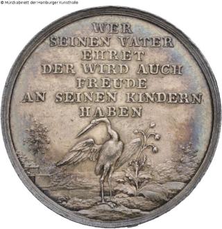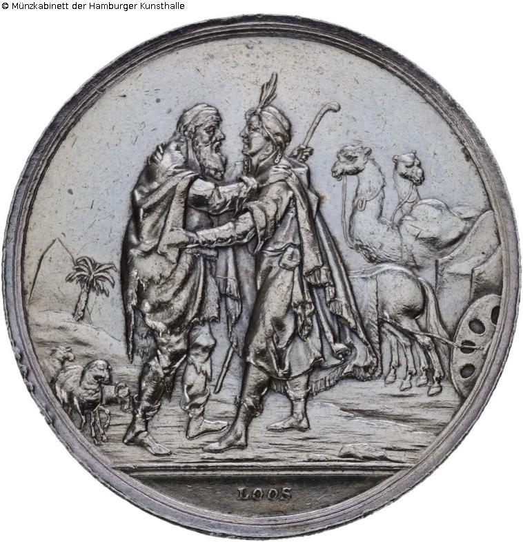 Obverse: The figure of the biblical Joseph embraces his father, the figure of the biblical Jacob. In the background a stony desert with mountains and a palm tree, as well as two camels, sheep and rams and a (chariot) drawn by horses (?). In the section the signature LOOS, double circle of lines; reverse: six-line legend in the field, below standing bird (ibis?) in the middle of a mountainous landscape with trees, plants and a body of water, double circle of lines, legend: WER / SEINEN VATER / EHRET / DER WIRD AUCH / FREUDE / AN SEINEN KINDERN / HABEN; good condition.