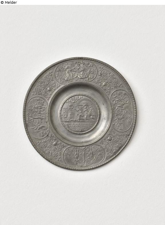Workshop in Nuremberg. Round, slightly recessed shape. On the 4 cm wide rim, four transverse oval medallions with scenes from Genesis: Adam and Eve under the tree; God pointing out the tree of knowledge to Adam and Eve; the creation of Eve; expulsion from paradise. Between each medallion is a vase with vines and flowers. Round medallion in the centre. Depiction: Noah offering a sacrifice after the Flood. In the background, the Ark and a rainbow. Below the depiction: NOE + GIENG + AVS */DER + ARCH + GETRA + OPFERD/16. GOTT.; In the field depicting the creation of Eve, the master's mark of Paulus Öham the Elder, in which the mark of Hans Spatz II is stamped; sticker from Hülsmann with attribution and literature.