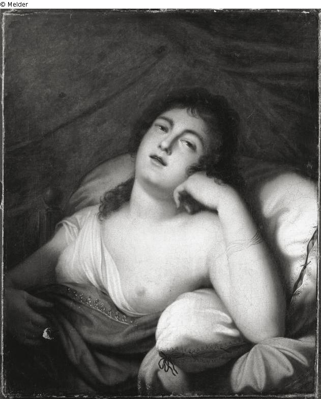 Young woman with bared left breast leans back into a pillow. Left hand holding the head, right hand holding a blue robe. Curly hairstyle. A red curtain forms the base.