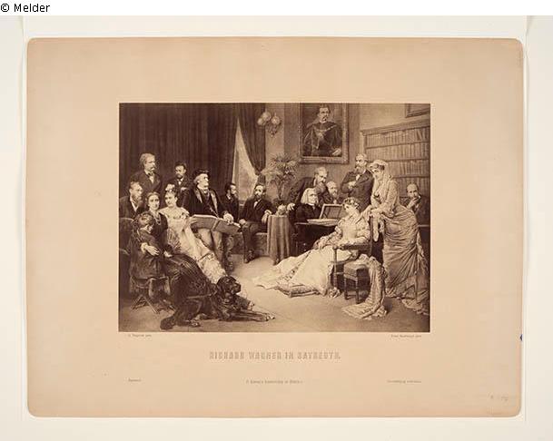 Group picture with Richard Wagner (a music book on his lap), Cosima, Siegfried Wagner, Liszt at the piano and Hans Richter.