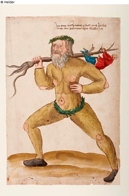 A full-figured Schembart runner with a face mask, long cheek beard, shoulder-length hair and green laurel wreath. He wears a green woolen dress covering the entire body, which only covers nipples, navels, elbows and knee joints. He holds a thin branch with his left hand, on which a man is attached to his hands and feet, as to torture. On the sheet in the picture above the figure betextet: "Inn eines Holtzmanns gstalt gantz tierlich Mitt dem Schempart thett lauffen ich"