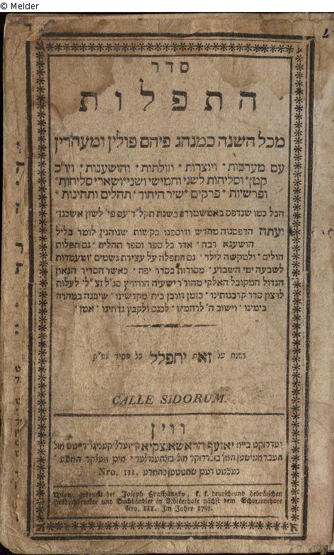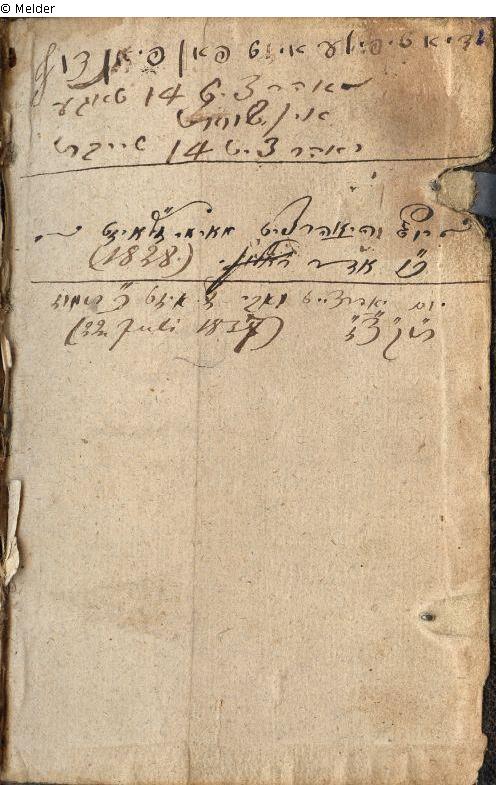Abb. 1: Titelblatt in Hebräisch sowie Deutsch mit hebr. Buchstaben; Abb. 2: drei handschriftliche Jahrzeit-Eintragungen, in Hebr. sowie Dt. mit hebr. Buchstaben; namentl. Nennung: Meyer; erwähnte Daten: 26. Adar (1838); 20. Tamus 5597 (22. Juli 1837)