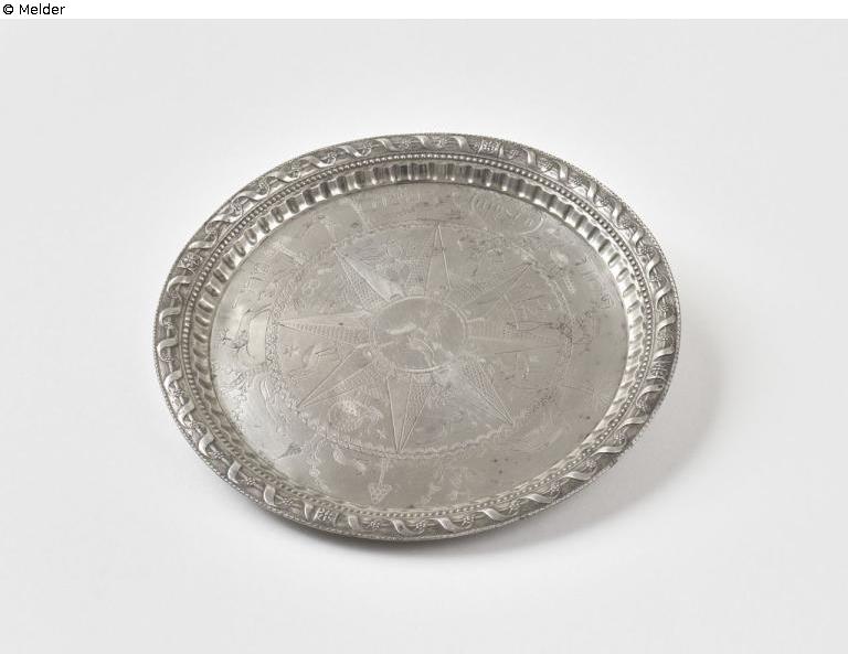 Edge embossed with floral and ribbon ornamentation, finished with egg-and-dart moulding on the inside. Slightly recessed, flat shape. In the centre, inscribed within a circle of small ornaments, an engraved eight-pointed star. The entire round surface of the plate is decorated with concentric animals, a hunter, Lady Justice, and Hebrew inscriptions (פסח, מרור, ביצה). Engraved in the outer circle in a heart-shaped border: I. H. B. * L. B. 1812. Engraved to the left of this: VIVAT. - Pewter mark on the reverse: ENG BLOC angel; hallmarked [U]; sticker with inventory number of the museum and Kösters Kunstkammer.