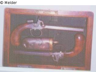 Futteral mit einem Paar Duellpistolen, dazu Pulverflasche und kleiner Kugelbehälter (?), spiegelbildlich angeordnet in einem verschließbaren und tragbaren Kasten.