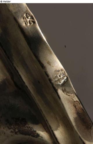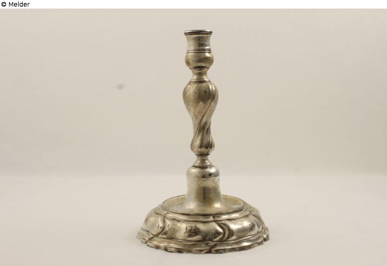 The single-flame silver chandelier stands on a round base with stepped edges. A decoration of winding folds runs over the edges. The bell-shaped intermediate piece placed on the foot supports the shaft, which is shaped like an inverted baluster and has twisted features. The spout resting on top is spherical in its lower part and then slightly retracted over a profiled rod. At the upper edge it swings out again slightly in a bulbous edge. Dotted inscription in italics on the foot edge/edge: "E.B. d. 25. December A. 1776",
