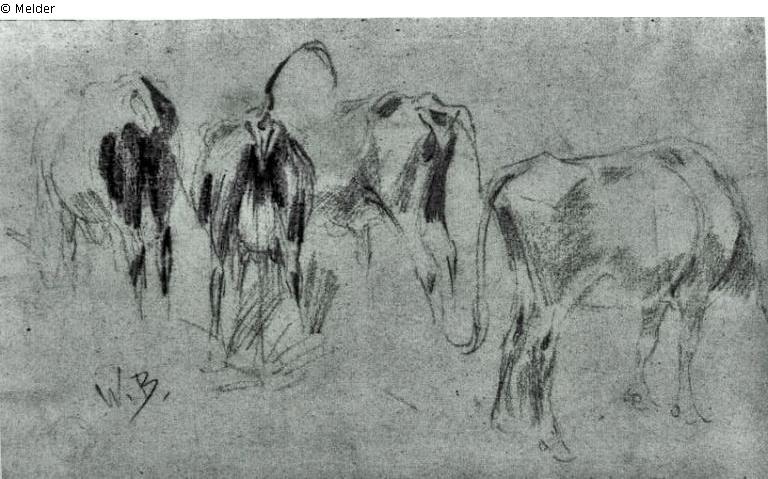 Motiv: Von den vier Kühen, die aus unterschiedlichen Perspektiven wiedergegeben sind, steht die zweite von links in strenger Rückansicht zum Betrachter und verrichtet mit emporgehaltenem Schwanz ihr Bedürfnis. Wvz.-Nr. Br 531