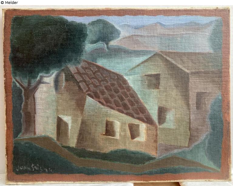 On the top left of the stretcher a white label: "B.A. 00739", on the right half of the label a round stamp: "ZOLL I-11 / Kreuz als Zeichen", on the right next to it handwritten in blue: "985 / G. K. 2211-1", to the right of it handwritten in blue: “B 6223”, on the top of the right stretcher a label partially torn off and covered by canvas: "GAL...FLECHTHEI / BERL.../ Lüt... DÜSSELDO / Königsallee 3.../ B ...23 / D ... / E ...(3? ) 8 / Ju... Gris /" Title illegible, only one word, below BStGS label: "Inv. Nr. 14236 Kleine Landschaft", white sticker with jagged edge and blue border at bottom centre, on it handwritten in black: “B 3”, black stamp at centre left: “Rudolf Richter / Düsseldorf /” [illegible address].