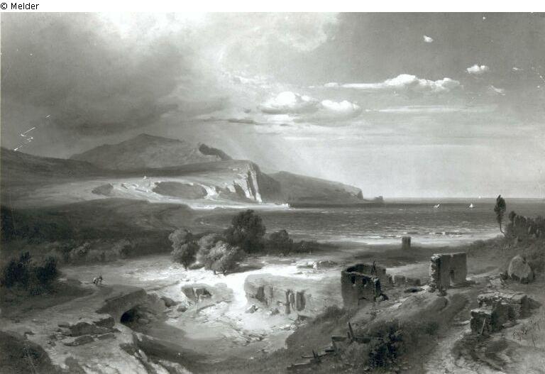 Found-Object Report | Object report South coast landscape Lost Art-ID221012 Previous Next Artist / Creator Bamberger, Fritz Birth 1814.10.17, Würzburg Death 1873.08.13, Neuenhain (Taunus) Place of activityMünchen TitleSouth coast landscapeObject typePaintingGroup of reported objectsPaintingMaterial / TechniqueOil / painted Height 37.00 cm Width 55.50 cm Inventory numbermü9864Description Signatur: Fritz Bamberger/fec.; Rechts vorn Ruinen, links Baumgruppe. Hinten links Felsberge, rechts daneben das Meer. Read more Read less Holding Kulturgüter aus dem ehemaligen ReichsvermögenPublished since2001 Contact Kunstverwaltung des Bundes Herbert-Bayer-Straße 5 13086 Berlin Germany E-Mailprovenienzforschung@kvdb.bund.deHomepagehttp://www.kunstverwaltung.bund.de