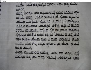 Thorarolle (Fragment) mit Text von 3. Mose 4, 35b (Leviticus) bis 4. Mose 11,16a (Numeri), Zustand sehr gut, keine VerzierungenAufbewahrung in mit hellbraunem Leder überzogenen Rolle