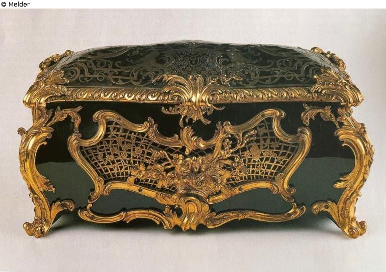 Rectangular casket, tortoiseshell with brass inlays and rosewood (Boulle technique), gilt bronze.