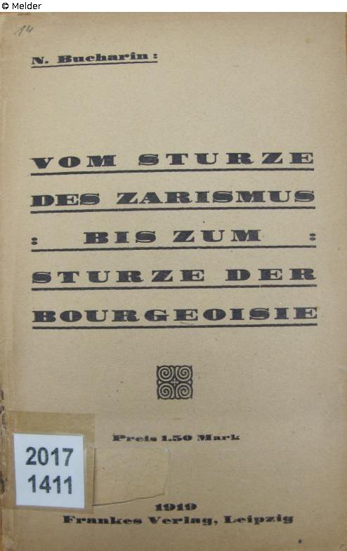 Found-Object Report | Object report Vom Sturze des Zarismus bis zum Sturze der Bourgeoisie Lost Art-ID623451 Previous Next Author Nikolaj Bucharin Publisher Franke TitleVom Sturze des Zarismus bis zum Sturze der BourgeoisiePlace of releaseLeipzig Date of publication1919Object typeBookGroup of reported objectsLibrary objectsSignatureW 01/2017.1411Description 8°, stamp cut from title page, back cover missing Read more Read less Provenance Suspicion of Nazi-looted property, 2017 IOS Regensburg Read more Read less Literature / Source Bucharins Werke sind in der Liste des schädlichen und unerwünschten Schrifttums angeführt. Read more Read less Published since08.10.2024 Contact Leibniz-Institut für Ost- und Südosteuropaforschung Bibliothek Landshuter Str. 4 93047 Regensburg Germany Homepagehttps://leibniz-ios.de/bibliothek/ueber-die-bibliothek Contact Tillmann Tegeler, M. A.PositionArbeitsbereich Bibliothek und elektronische Forschungsinfrastruktur Leiter des ArbeitsbereichsE-Mailtegeler@ios-regensburg.de