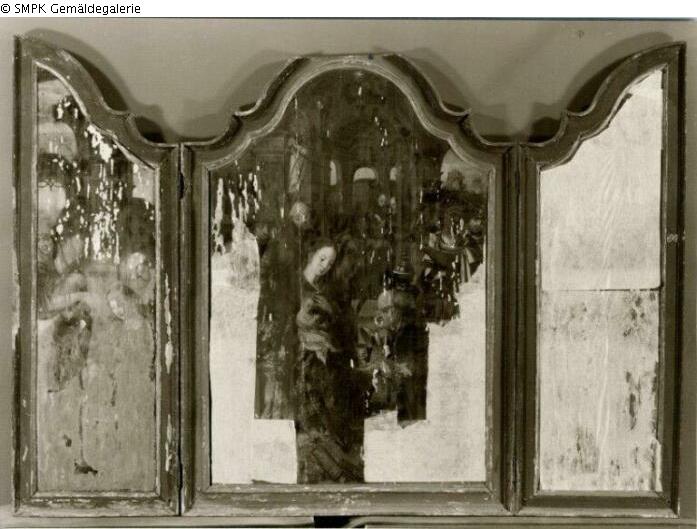 Unbekannt: Unter dieser Rubrik wurden sowohl in der Gemäldegalerie (Ost) als auch in der Galerie Dahlem Bilder verzeichnet, deren Einlieferungsdatum und -herkunft völlig unbekannt sind. Es kann sich wie bei den unter "Priv" verzeichneten Stücken sowohl um solche aus eingelagertem Privatbesitz als auch um begonnene und nicht abgeholte Restaurierungsaufträge oder liegengebliebene Kopistenarbeiten handeln. Geismeier, Fremdbesitz, 1999, S. 67 Katalogtext: Der Solly-Übernahmezettel dat. aus dem sog. "Vorläufigen Verzeichnis" von 1819, vgl. W. Köhler, Die Sammlung Solly, Merkmale und Kennzeichen ihrer Bilder. In: Miklos Boskovits, Frühe italienische Malerei, Gemäldegalerie Berlin 1988, S. 185. Nach Köhler ist die Sollysammlung niemals in toto katalogisiert worden. Nicht jedes Solly-Zeichen weist auf die von der Berliner Gemäldegalerie übernommenen Solly-Bilder, da bei der Bestandbereinigung 1880-1886 zahlreiche Depotstücke von Berlin an andere Institute und Provinzmuseen abgegeben worden sind. Geismeier, Fremdbesitz, 1999, S. 67 f.