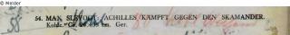 „Rachetrunken wegen des Todes von Patroklos dringt Achilles ins Heer der Trojaner und metzelt alle Gegner nieder. Um Achills Wüten zu entgehen, flieht ein Teil der Trojaner stadtwärts. Ein anderer flüchtet ans Ufer des Flusses Skamandros und hatte dort Schutz unter der überhängenden Böschung gesucht. Als Achill sie entdeckt, lehnt er seine Lanze an einen Tamariskenstrauch, zieht sein Schwert [in dieser Skizze hat er noch die Lanze als Waffe] und ein grässliches Abschlachten beginnt. Geschrei und Geröchel war lauter als das Tosen des Wassers, das sich rot gefärbt hatte. Nachdem er das Schwert nicht mehr halten konnte, fing er mit seinen Händen zwölf Jünglinge ein, um Sie als Götter-Opfer auf dem Scheiterhaufen für den toten Freund Patroklos zu verbrennen“ (UW)