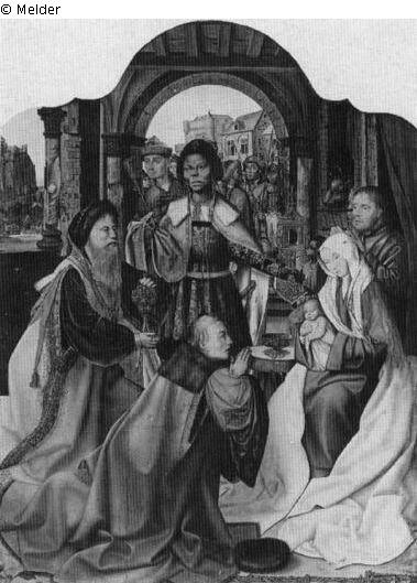 Panel painting: Depiction: the adoration by the Magi: they offer their gifts (gold, frankincense and myrrh) to the Christ child; adoration; gift; gold; gold(s); frankincense; myrrh; offering; spice
