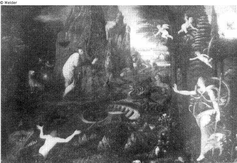 Scene in a landscape with trees and a cliff to the left, and a pool between them. To the right is a woman with a quiver on her back and an arrow in her right hand. Above her are three cupids. In the pool is a nude man, being chased by a monster.