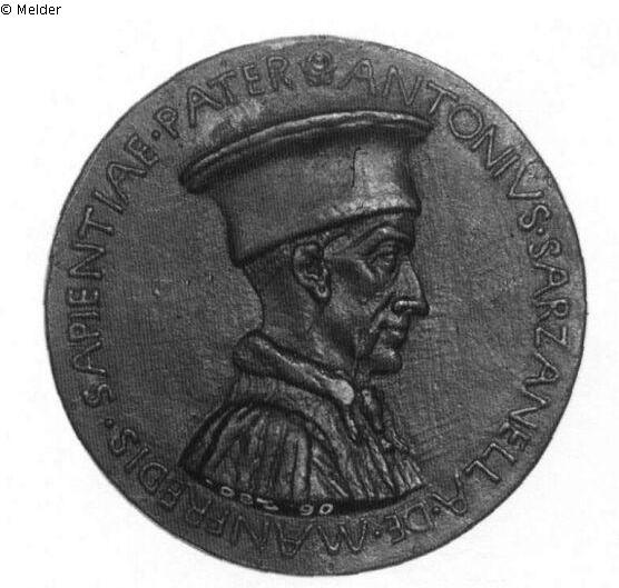 Medaille, alter Guß, oben eine Durchbohrung. Vs.: Brustbild nach rechts mit flachem Hut und Pelzkragen. Umschrift: ANTONIVS SARZANELLA DE MANFREDIS SAPIENTIAE PATER. Rs.: Die Klugheit mit Doppelgesicht sitzt auf einem von zwei Hunden gebildeten Thron. In der Linken hält sie einen Schild mit dem Wappen Bolognas, in der Rechten einen Spiegel und einen Zirkel (oder Kompaß). Umschrift: IN TE CANA FIDES : PRVDENTIA SVMMA REFVLGET [Rosette]. Rechts im Feld die Signatur OPVS / SPERAN / DEI
