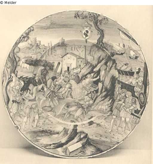 Decorated with the Pucci arms and superbly painted with a stag hunting scene, in the background a castle, and galleys and felucca-like vessels to the right, inscribed on an oblong box in bianco-sopra-bianco with the signature "Fra Axanto. A. da Rovigo, i Urbino". The Unsderside with two yellow bands around the rim, the sunk centre inscribed in blue: "MDXXXII in Libia giunto Enea eo sette Naui co li compagni treo dal bosco al lito sette gra cervi poderosi e grani. / Nel I libro della Eneida virgiliana. F. Zanto A.R.i. Urbino"