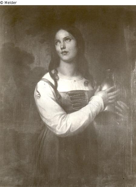 Kniebild. In rotem Silberketten verschnürtem Mieder mit grünem Rock. Den Helm im linken Arm. Bild wurde zusammen mit Bildnis des Kriegsrats J.J Crelinger (XI 24666) aus dem Nachlass Clara Groschke,einer Enkelin von Auguste Crelinger, eingeliefert von dem Vetter der Frau Groschke Geheim. Rat. Caspar