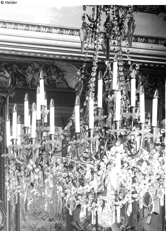 Dresden Castle, 2nd floor east wing, Small Dining Hall; In inventory no. 1 of 31.01.1920, as part of the settlement agreement between the Free State of Saxony and the former royal house of 1924 1 large bronze chandelier with glass hanging and 48 candle lamps, electric is listed in the Small Dining Hall, as room inventory marked with a red cross, belongs to the state; An exact date of removal is not on record. The measures were completed in the summer of 1944. The sconces were probably removed on April 26, 1944 and taken to the relocation site at Rammenau Castle. Nothing is known about the circumstances of the loss of these objects. It is assumed that they were lost in connection with the events of the Second World War.
