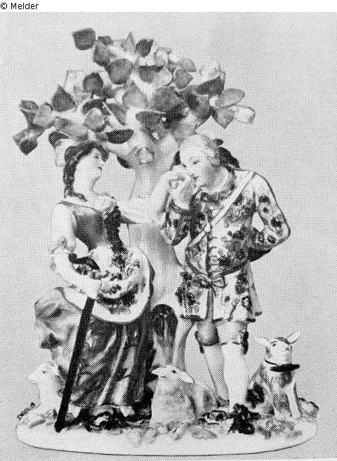 der Handkuß. Unter einem Baum Schäferin in Schreitstellung mit Hirtenstab, der ein links stehender Kavalier die Hand küßt. Auf dem blumenbelegten Sockel zwei Schafe und Spitz. Bunte Bemalung: Sie in weißem, bunt geblümtem, resedagrün gefüttertem, vorn geschürztem Rock über hellviolettem Unterrock, schieferblauem Mieder mit rotem Schleifenbesatz; er in buntgeblühmtem, zitronengelbem Schoßrock uber meergrünen Kniehosen und eisenrotem Hut. Geringe Reparatur. Modell von Kändler.