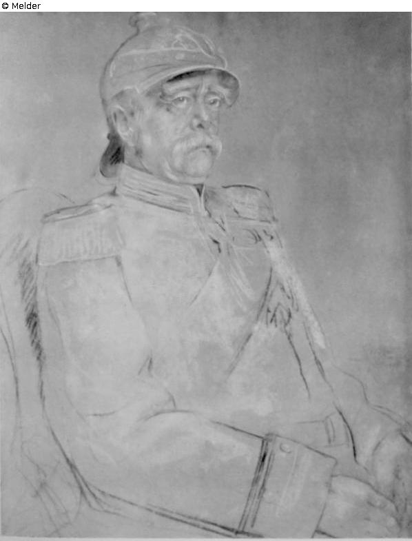 Life-size hip image in half profile to the right, eyes directed into the distance, the hands in the lap juxtaposed. The prince wears the uniform of the Halberstadt cuirassiers in the General Septim, Order and Helm. White lights on face and Heln, white colander. Signed right below: F. Lenbach, Friedrichsruh 1891.