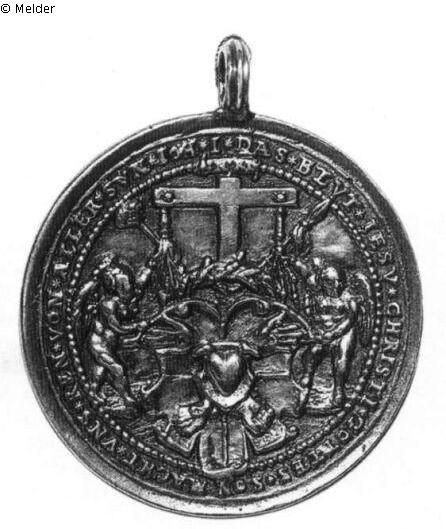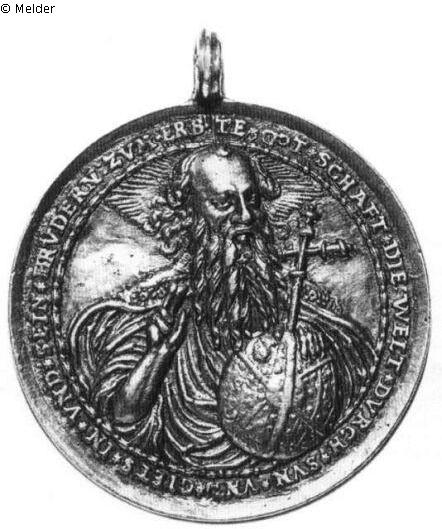 Medaille, gehenkelt. Vs.: Halbfigur des segnenden Gottvaters. Mit der linken Hand hält er die Weltkugel mit dem Kreuz darauf. Umschrift: GOT SCHAFT DIE : WELT DVRCH SVN VND GIBTS IN VND SEIN BRUDERN : ZVM ERB TE (Interpunktion: Sterne). Rs.: Leidenswerkzeuge Christi, davor ein von zwei Engeln gehaltener Schild mit den Wundmalen Christi. Umschrift: DAS BLVT IESV CHRISTI GOTTES SON MACHT VNS REN VON ALLER SVN IOH I (Interpunktion: Sterne).