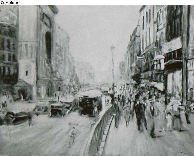 The picture shows a busy street scene on the Boulevard Poissonnières in Paris. A railing and a lantern divide the view into two halves: on the right, numerous people stream along the pavement, while cars move along the road on the left. The scene is framed by tall buildings.