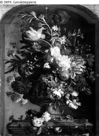 Panel painting: Depiction: Flowers in a vase; Flower; Vase; Signature: Below: Jan van Huysum.fect. 1722; Dimensions: 110 x 83 cm