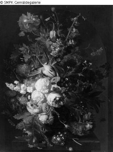 Panel painting: Depiction: Flowers in a vase; Flower; Vase; Signature: Right on the tabletop: Jan van Huysum fecit; Measures: 79 x 61 cm