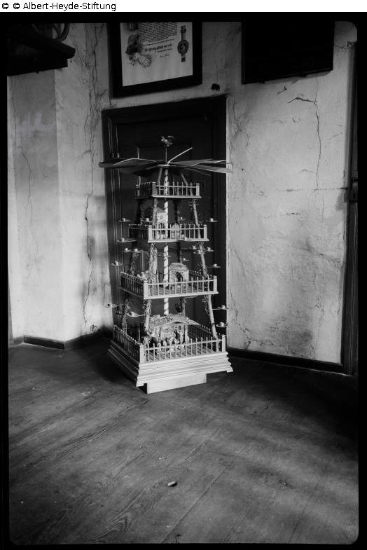 Four-storey Christmas pyramid, which rotates using the thermal energy of candles. Small motifs were staged on the fenced-in platforms, with a nativity scene at the base.