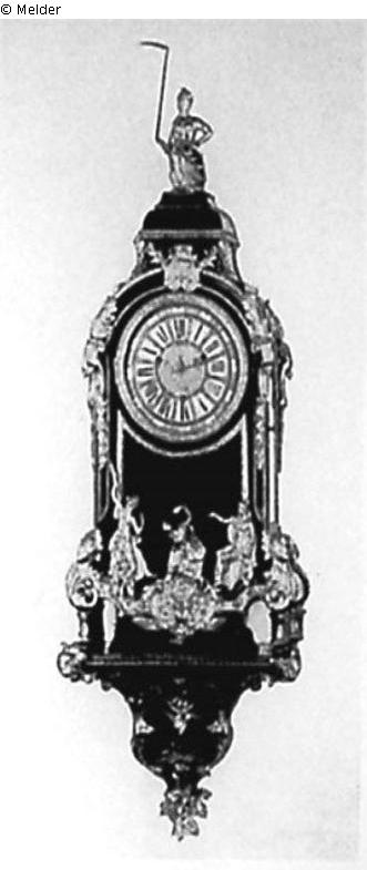 Grün lackiert, Louis XVI. Mit reichstem Goldbronzebeschlag: an den Ecken Voluten mit Frauenköpfen, Kartusche mit Silenkopf in breitem Bandfries, darüber die drei Parzen; als Bekrönung sitzende Minerva. Frankreich.