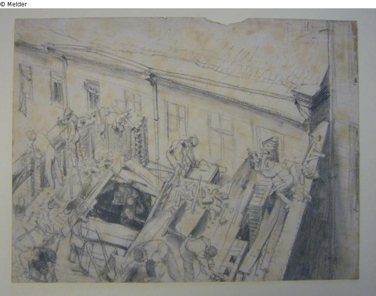 inscribed and dated top right: "Ad. Menzel 75"; house construction with construction workers at work, seen from above