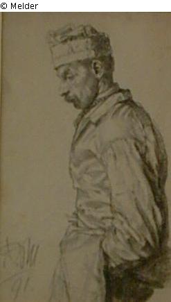 signiert A.M.91; halbe Figur im Profil, nachdenklich blickender Mann in Berufsbekleidung