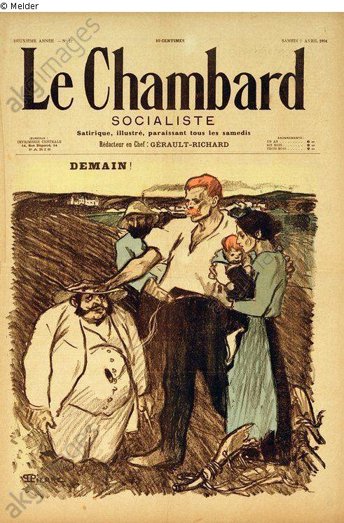 "Die Machtverhältnisse werden sich in der Zukunft radikal verändern. Das Proletarierpaar ist gewachsen und sich seiner Kraft bewusst. Interessant, dass Steinlen hier nicht den männlichen “Riesen Proletariat“ agieren lässt, sondern die Arbeiterfamilie. Der rothaarige Arbeiter drückt jetzt dem Großgrundbesitzer den Hut so vehement ins Gesicht, dass diesem die Zigarre aus dem Mund fällt. Aus dem mächtigen Großagrarier, der sich wie ein Sklavenhalter aufführte, ist ein lächerlicher Zwerg geworden." (UW)