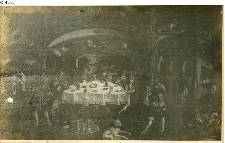 Drei Szenen des Gleichnisses vom reichen Kaufmann und armen Lazarus in einem Bildfeld vor Architekturkulisse. Zentrale Mittelszene zeigt prunkvoll gekleidete Tischgesellschaft des reichen Kaufmannes. In der rechte Bildhälfte der arme Lazarus mit Bettelschale; in der linken Bildhälfte Sterbeszene des reichen Kaufmannes. Schriftzeilen im Bildfeld erläutert die jeweiligen Szenen.