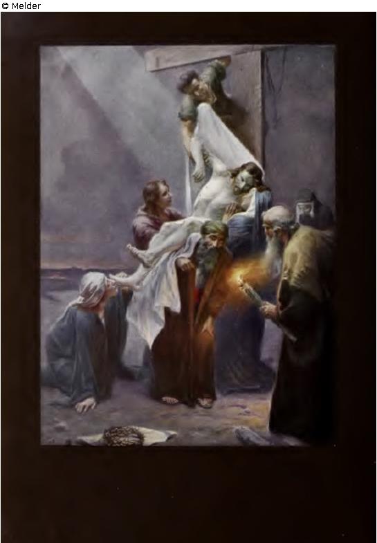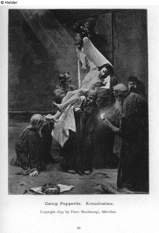 The body of the Lord is carefully taken down from the cross by the men and women. Bottom left: G. Papperitz, architectural frame.