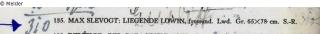 Eduard Fuchs Collection since 1909 to 1933 at the latest; 26.10.1933 confiscation by the Berlin-Zehlendorf tax office "Paket Nr. 5: 1 Bild, darstellend eine Löwin aus dem Jahre 1901 (Slevogt)"; delivery of the painting on 15. 12.1933 to the Gestapo; auction house Rudolph Lepke, Berlin, catalogue 2114, p. 16. On 16 and 17.06.1937 the painting was sold as no. 135: "Max Slevogt: Liegende Löwin – fressend. Lwd. Gr. 65 x 78 cm. Silberrahmen" auctioned; bought by art dealer Hildebrand Gurlitt for RM 310,- (estimate: RM 300,-); around 2000 probably auctioned by Grisebach; whereabouts unknown