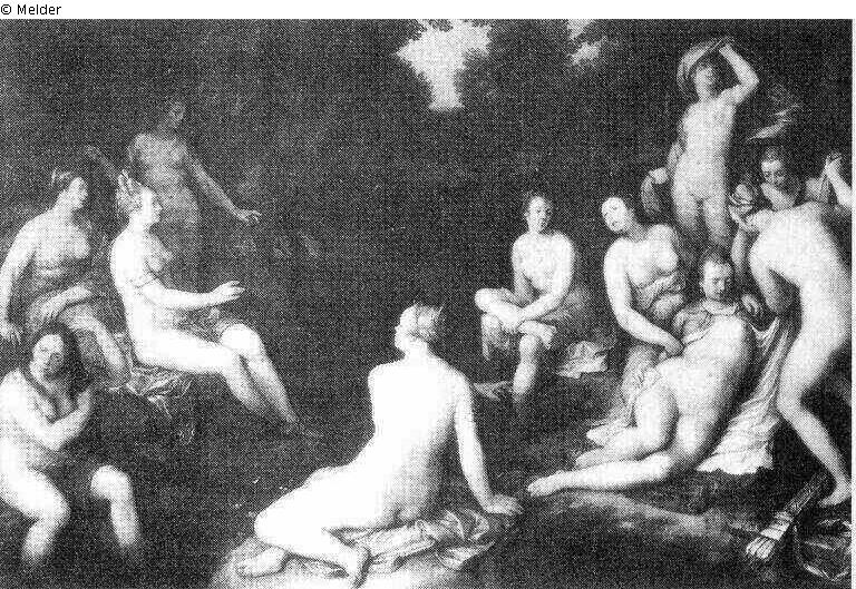 To the left on the wooded shore of a stream are Diana and three nymphs. To the right surrounded by six nymphs is Callisto, being undressed by two nymphs.