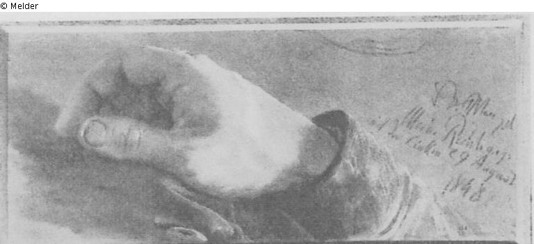 Search Request | Object report Die Hand des Künstlers Lost Art-ID450232 Previous Next Artist / Creator Menzel, Adolph Birth 1815.12.08, Breslau Death 1905.02.09, Berlin Place of activityBerlin TitleDie Hand des Künstlers Dating1849Object typeDrawingGroup of reported objectsGraphicMaterial / TechniqueChalk coloured ; Paper brown / drawn Height 30.00 cm Width 12.00 cm Description bez. u. beschr. r.: A. Menzel. Meine Rechte gez. mit der Linken, 29. August 1848 Read more Read less Provenance Hermann Paechter, Adele Paechter, Auktion H. W. Lange 5./6. April 1940, Nr. 112; Privatbesitz Hamburg Read more Read less Published since11.01.2012 Contact Dr. Monika TatzkowPositionWissenschaftlicher DokumentationsdienstPhone+49 (0) 30 64 128 13E-Mailtatzkow@t-online.de