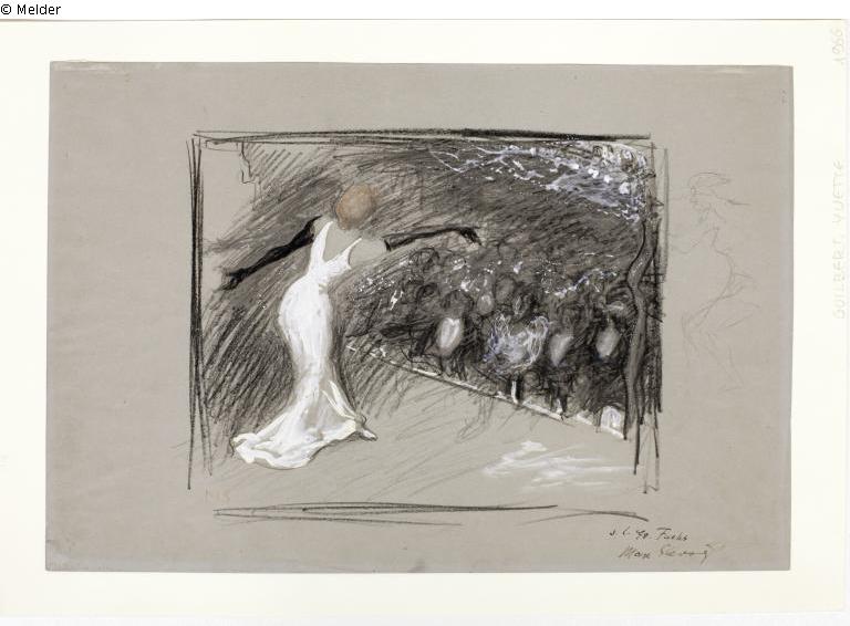 „Im Frühjahr 1900 besucht Slevogt, wahrscheinlich in Begleitung von Eduard Fuchs, die Weltausstellung. Im deutschen Pavillon der Weltausstellung wird sein Gemälde „Schehezarade“ (1897) gezeigt. Slevogt erhält dafür eine „Mention honorable“ bei der Internationalen Ausstellung. Fuchs zeigt ihm die Pariser Szene und nach einem Besuch im Moulin Rouge entsteht diese schöne Skizze der rothaarigen Sängerin Yvette Guilbert, die mit ihren schwarzen Handschuhen das Publikum zu berühren scheint“ (UW)