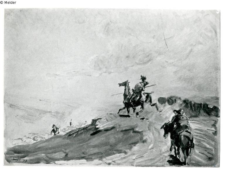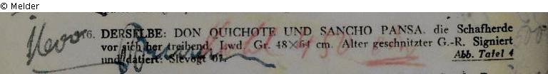 Eduard Fuchs Collection until 1933; 25.10.1933 confiscation by the Gestapo; auction house Rudolph Lepke, Berlin, Catalogue 2114, p. 14. On 16 and 17.06.1937 the painting was sold as No. 116 "Don Quichote und Sancho Pansa, die Schafherde vor sich hertreibend. Leinwand, 48 x 64 cm. Alter geschnitzter Goldrahmen. Signiert und datiert: Slevogt 07“. Abb. Tafel 4." auctioned off; bought by the Lepke commissioner Carl Braunstein (Berlin-Lichtenrade, Straße 6a Nr. 25 - probably commissioned by Fritz Slevogt, Hamburg, for 500,- RM - estimated price 450,- RM); later privately owned in Düsseldorf; whereabouts unknown