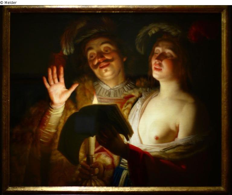 Halbfiguren eines jungen Mannes und eines jungen Mädchens mit entblößter Brust, die in der Linken ein Notenbuch hält, aus dem beide singen, in der Rechten eine brennende Kerze, deren Licht die Gesichter von unten beleuchtet. G.-R.; gerahmt;
