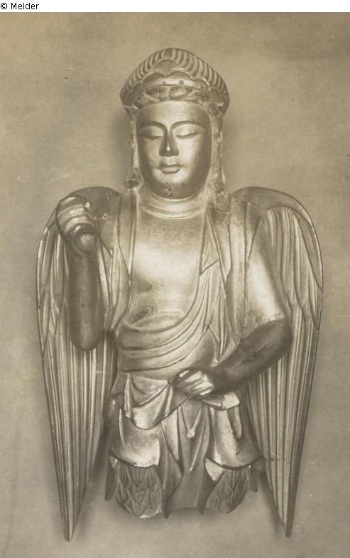 The god of death is amiably depicted as a winged angel. His attributes, such as his metal hanging, are missing. A split-off part of the lower back as well as the type of section prove that this half-figure was inserted into a shrine. The attachment of the wings is unusual.
