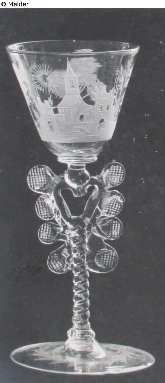 high goblet shape, frosted cut decoration on the bowl, depicting a building, sun, trees as well as a rider and a hiker, on the foot an engraved cross