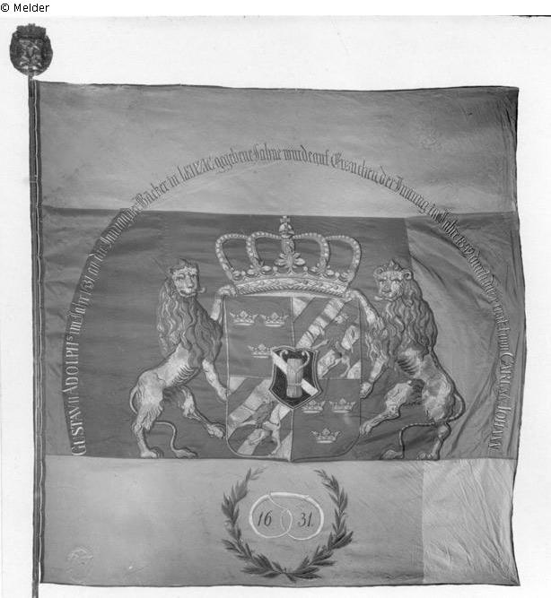 Im mittleren Feld zentral das große schwedische Wappen: Ein gevierter Schild mit Mittelschild. Im rechten Obereck und linken Untereck je drei Kronen, im linken Obereck und rechten Untereck je vier schräglinks-Balken mit springenden Löwen. Im Mittelschild ein Schrägrechtsbalken mit der Wasagarbe. Über dem Wappenschild eine Königskrone. Als Schildhalter zwei springende Löwen, den Schwanz untergeschlagen. Über dem Wappen in einem Dreiviertelkreis und in das obere Feld übergreifend die Umschrift: „Gustav II Adolph's im Jahr 1631 an die Innung der Bäcker in Leipzig gegebene Fahne wurde auf Ersuchen der Innung im Jahre 1842 durch diese ersetzt von Carl XIV. Johann.".