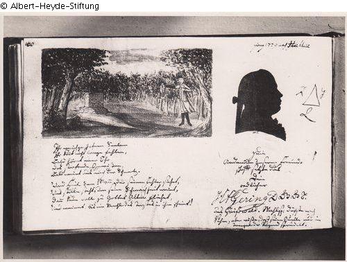 Entry of H.F. Gering from Greifswald with his silhouette. In addition, a nine-line poem, as well as a watercolour depiction of a forest clearing with an altar and a young man. A H.F. Gehring from Greifwald was among the subscribers to Klopstock's Messiah in 1780.
