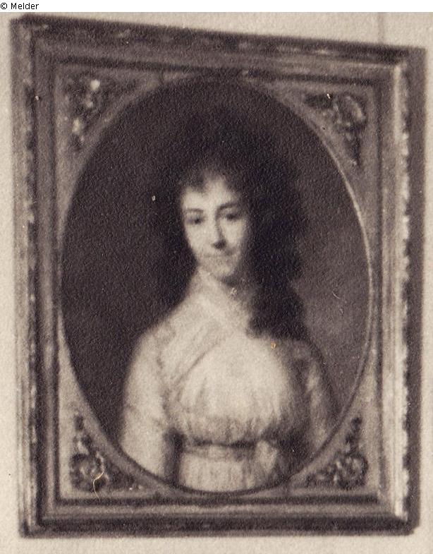 Young woman with curly shoulder length hair and high necked light dress with bow under breast. Oval in decorated square frame.