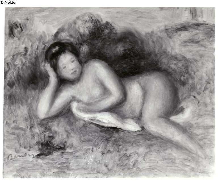 Very pearlescent. Reclining nude in landscape. Woman with red hair lying on a white bath towel, right arm propped up, left arm placed in front of her chest, left leg slightly bent. Signed lower left