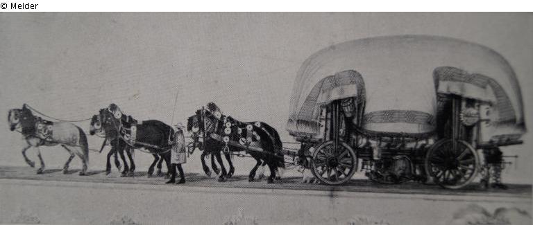 Carriage with 5 horses and merchant's wagon (covered wagon), accompanied by a coachman (walking alongside the horses)
