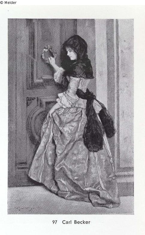 An elegant young lady in a blue silk dress, black lace mantilla and sash, holding a door knocker in her hand.G.-R. Sign. a. dat.: 1878.